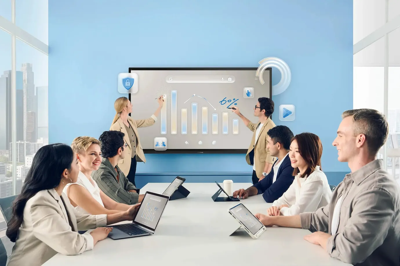 La certificazione EDLA (Enterprise Device Licensing Agreement) ti assicura un investimento a prova di futuro. Questo display EDLA funziona con il sistema operativo sicuro Android 15, che permette di usare in modo nativo tutti i principali servizi Google. Eviti incompatibilità e problemi di sicurezza, dato che Google Workspace, Google Classroom e il Play Store sono integrati direttamente. Grazie al potente processore octa-core e ai 16 GB di RAM, il multitasking è sempre garantito. Il moderno flusso di lavoro BYOD è reso più facile da quattro connessioni USB-C. I membri del tuo team possono collegare i loro dispositivi con un solo cavo per trasmettere segnali AV, usare la funzionalità touch, trasferire dati e ricaricare contemporaneamente con una potenza fino a 100 W. Questo fa sì che le presentazioni partano subito e il tempo di lavoro sia usato in modo efficiente.